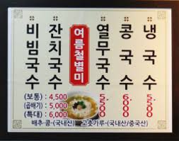 메뉴: 잔치국수(5천원), 비빔국수(5천원), 열무비빔국수(7천원), 냉국수(여름).
